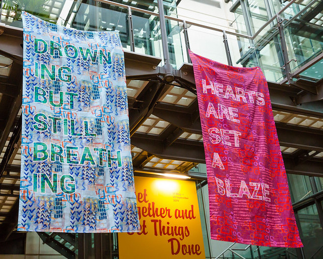 Radical Read used creativity to encourage young people to read more by examining historic and current texts, accounts and stories from protests involving young people. They found inspiration from research visits, such as the People’s History Museum Disrupt? exhibition and worked with poets from Young Identity . Artists Sally Gilford, Yussuf Mrabty and a group of young people created four banners which are on permanent display at Manchester College and they also produced a unique soundscape which you can listen to here.